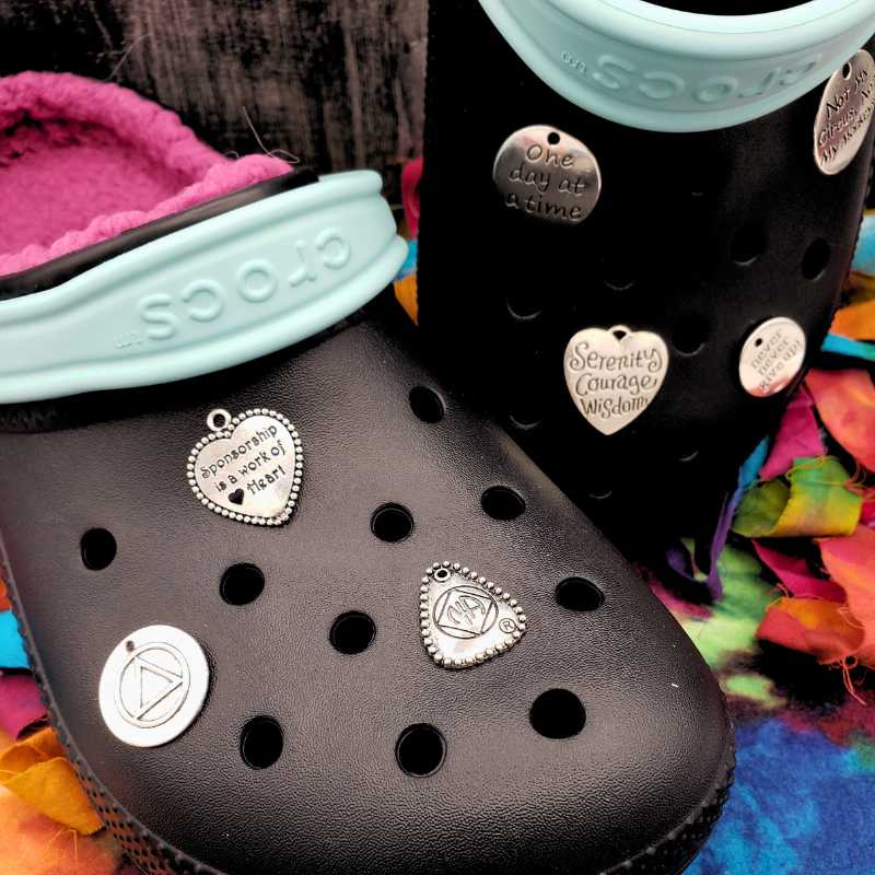 Look down and feel grounded in the comforting words that have helped millions find their path to sobriety. These handcrafted sobriety jibbit Croc charms are more than just accessories—they are motivating reminders to keep you inspired on your journey.