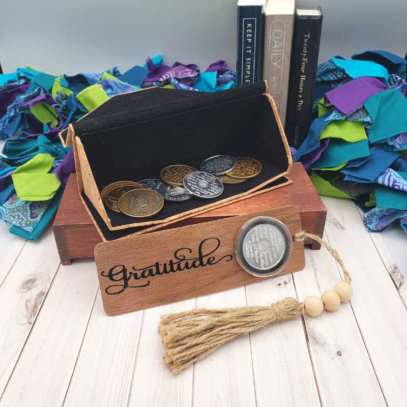 Gratitude Twelve Step Chip Holder Wood Bookmark with AA Medallion Box