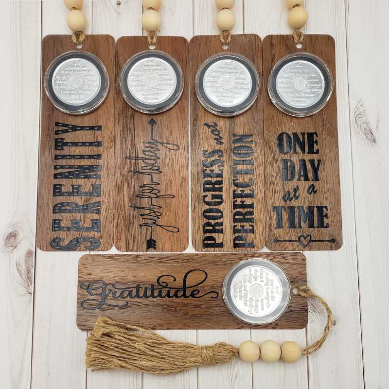 Starter chip included, featuring a Serenity Prayer design on a silver recovery medallion.