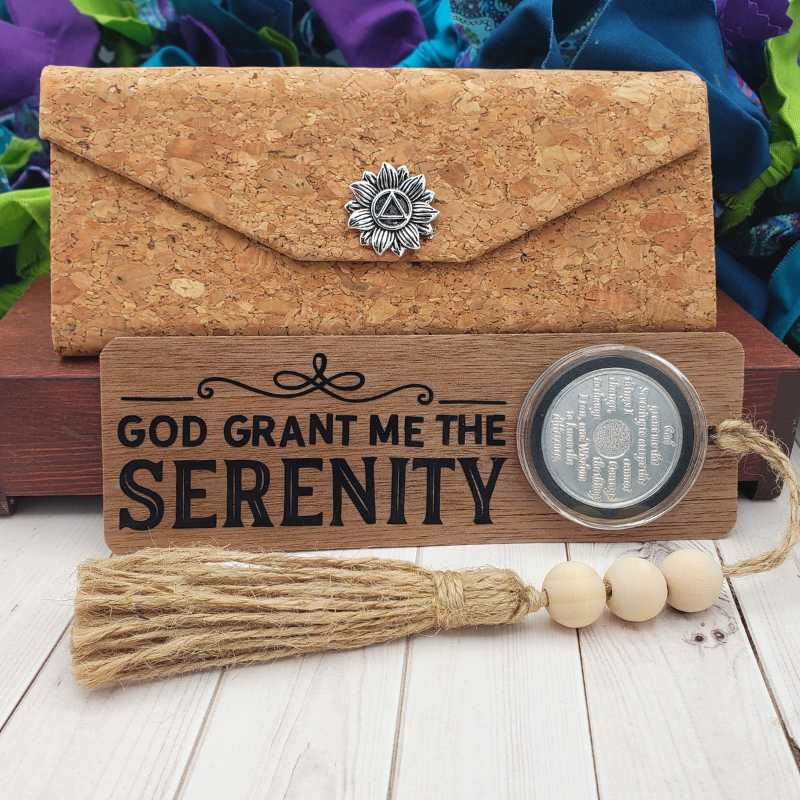 This thoughtful recovery gift set includes a wood bookmark adorned with the powerful Serenity Prayer phrase, paired with a recovery chip holder capsule adorning the bookmark. The capsule opens and closes, allowing you to prominently display your current sobriety medallion while safely keeping others stored in the accompanying box.