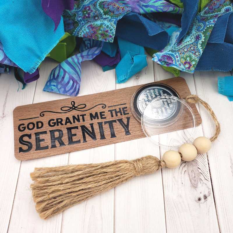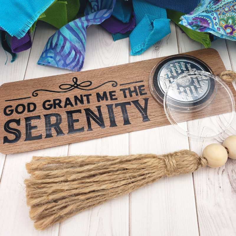 Included Serenity Prayer chip serves as a beautiful placeholder until your personalized medallion is ready to display.